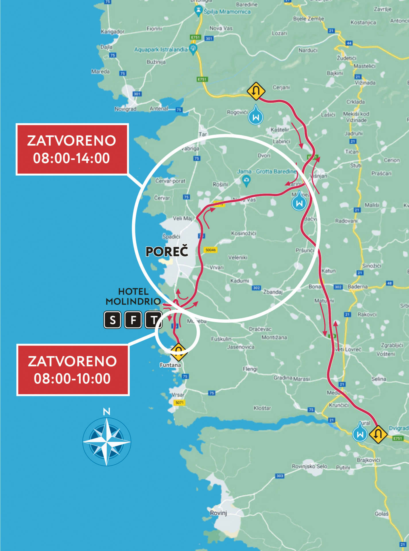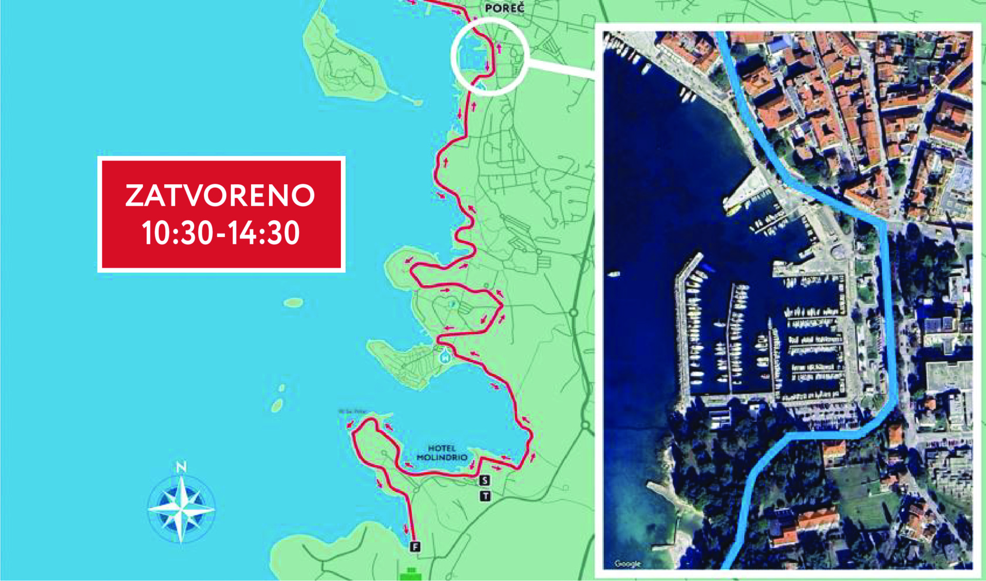 Tijekom trajanja utrke, na istarskim i porečkim cestama kojima prolaze biciklisti i trkači, na snazi će biti posebna regulacija prometa, a pojedine prometnice će privremeno biti zatvorene.